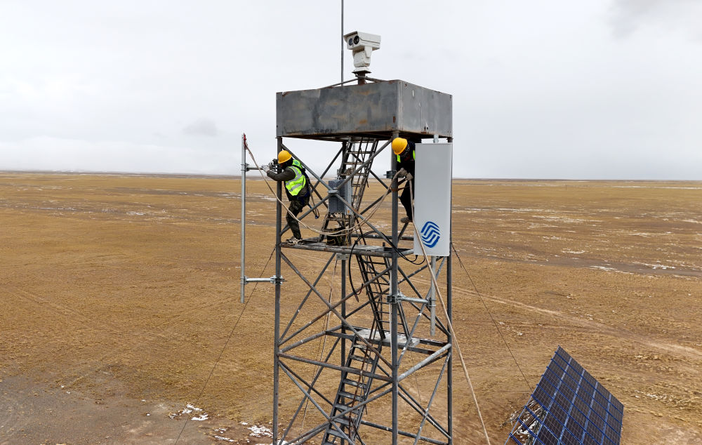 4月25日,中國移動通信集團(tuán)青海有限公司工作人員在可可西里庫賽湖附近安裝5G基站設(shè)備。(受訪單位供圖)