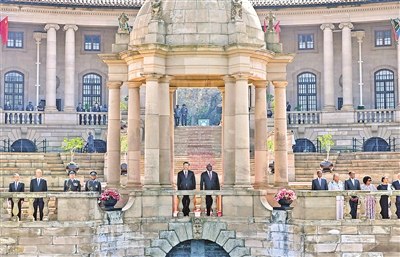 8月的比勒陀利亞,晴空萬里,惠風和暢。總統府廣場鮮花盛開,中南兩國國旗迎風飄揚。在總統摩托車隊護衛下,習近平乘車抵達總統府,拉馬福薩在下車處熱情迎接。兩國元首登上檢閱臺。儀仗隊行持槍禮,軍樂隊奏中南兩國國歌,現場鳴放21響禮炮。習近平檢閱南非儀仗隊。兩國元首同雙方陪同人員一一握手。