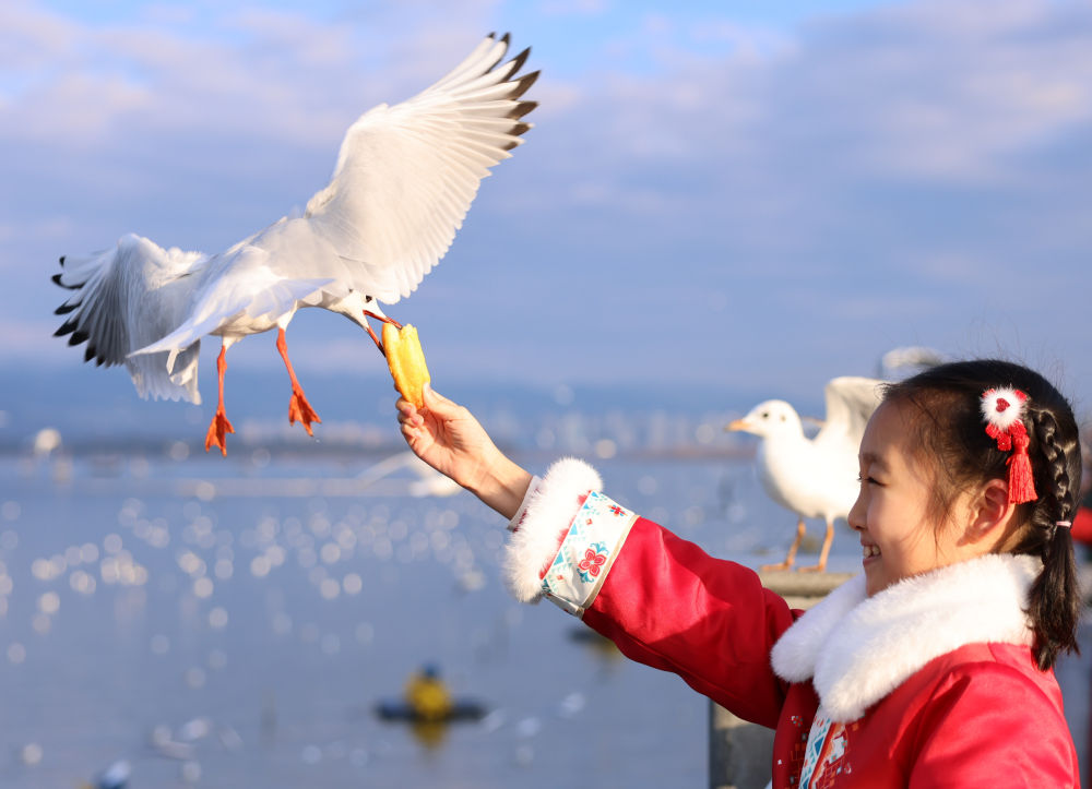 游客在昆明滇池邊投喂紅嘴鷗(2024年1月17日攝)。新華社發(劉元嵩攝)