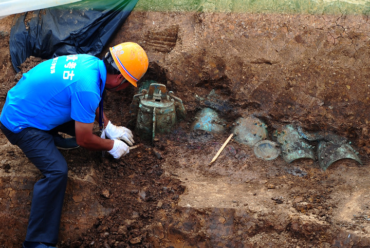 2013年7月4日,在M111墓葬內,工作人員在對編鐘進行挖掘工作。新華社記者肖藝九攝