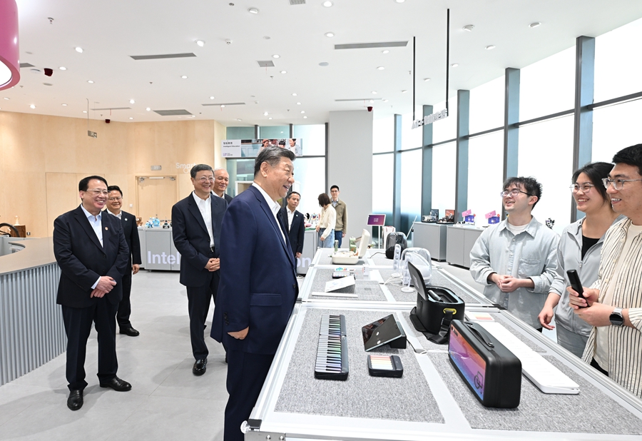 4月29日,中共中央總書記、國家主席、中央軍委主席習近平在上海考察。這是習近平在位于徐匯區的上海“模速空間”大模型創新生態社區人工智能產品體驗店考察。新華社記者 謝環馳 攝
