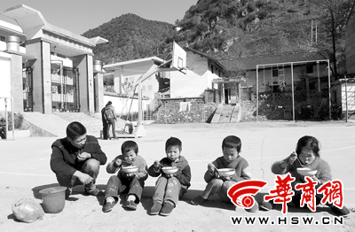 朱金魁將午飯送到學校,孩子們吃得很香。4個孩子的戶口讓他茶飯不思