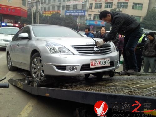 本網訊 (記者 李敏)商洛市區文衛路轉盤一直是禁止停車的,但是部分車輛仍亂停亂放,尤其是小學放學時段更為嚴重。圖為十二月十一日十一點左右,一亂停車輛被交警部門強行拖離。交警隊工作人員提醒各位車主要嚴格遵守交通秩序,切勿亂停亂放。