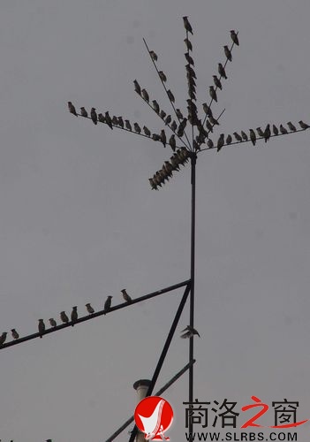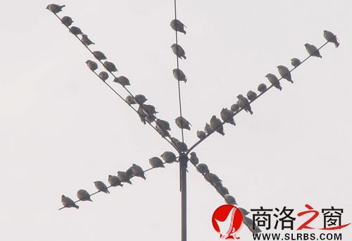 商洛日報訊(王璐)近日,有一群不知名的小鳥悄然出現并活躍在丹鳳縣城的上空,數量大約有七八百只,不時地盤旋起落于縣汽車站周圍的樓頂或者電線上,引來眾多路人駐足觀望。尤其是每天上午,在愛家超市樓頂的避雷及蓄水設施上,眾多小鳥聚集在一起,形成一個奇特的“鳥樹”,還發出輕微的鳴叫聲,親切而壯觀。當受到較大聲響的驚擾或是有人靠近時,它們又轟然而去,不見蹤影。該鳥羽毛顏色跟麻雀相似,體型比麻雀要大出兩倍以上,在它的頭頂上,有兩公分左右的翎羽,看上去十分漂亮。