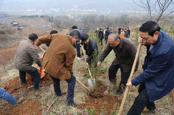 3月21日,市機(jī)關(guān)事務(wù)管理局干部職工50余人來(lái)到商州區(qū)楊峪河鎮(zhèn)銀明村,揮鍬培土,義務(wù)植樹(shù)2000余棵。 (王勇 攝)