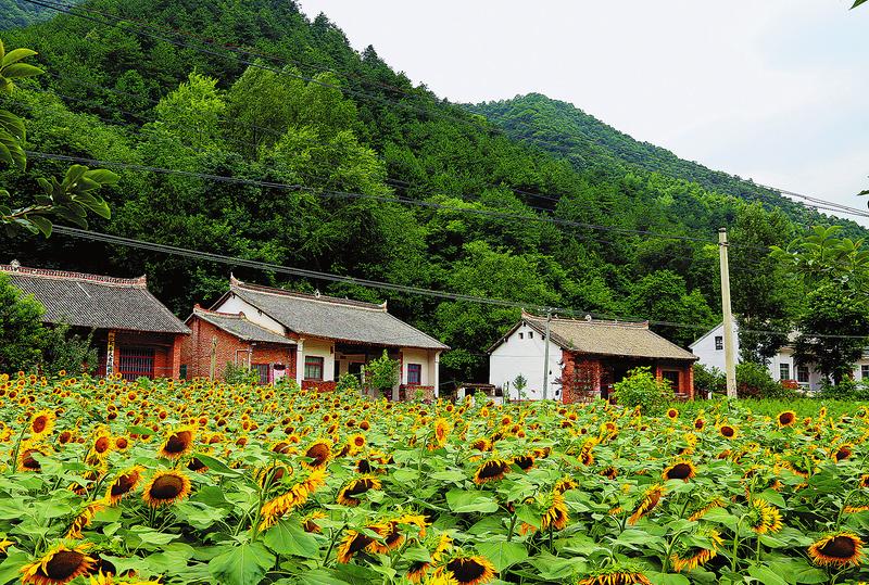 夏日的黑彰村是一幅以綠色為底、著色斑斕的優(yōu)美風(fēng)景畫,讓觀者無(wú)不贊嘆其絕妙的意境和別樣氣質(zhì)。走進(jìn)黑彰村,首先被豎立在眼前設(shè)計(jì)獨(dú)特的村牌所吸引,黃褐色的木頭和樸素的石頭相融合,在萬(wàn)頃綠濤的群山映襯下格外顯眼。寬闊平坦的水泥路向村子挺進(jìn),展現(xiàn)在眼前的是成片的綠色和金黃所組成的畫布。綠色是地里栽種的五味子和黃豆,目前正值迅猛生長(zhǎng)期,綠油油的像是大自然精心編織的綠地毯。金黃是盛放的油葵,舉著沉甸甸的花盤迎著太陽(yáng),向人們展示著它們的累累碩果。青瓦白墻的房屋散落在茫茫綠色之中,形成色調(diào)搭配和諧的漂亮畫面。