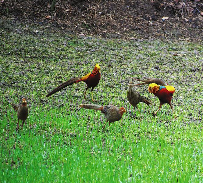 還有一種商州人稱為“野雞”的雉類,經常“藏頭不顧尾”。它只把頭藏到草叢里,尾巴還能被人看見,卻覺得自己已經藏好了,就不害怕人了。張生超每次都會靜靜地等待,“野雞”覺得不再受到威脅了,就把頭伸出來,眼睛如同對視一樣,看張生超一眼,再把脖子伸出來,覺得還是沒有威脅,便把翅膀撲棱撲棱地扇起來,“嗚嗚”地開始叫。其他的“野雞”聽到了它的叫聲,都從隱蔽處鉆出來,張生超就能抓拍到不少好鏡頭。