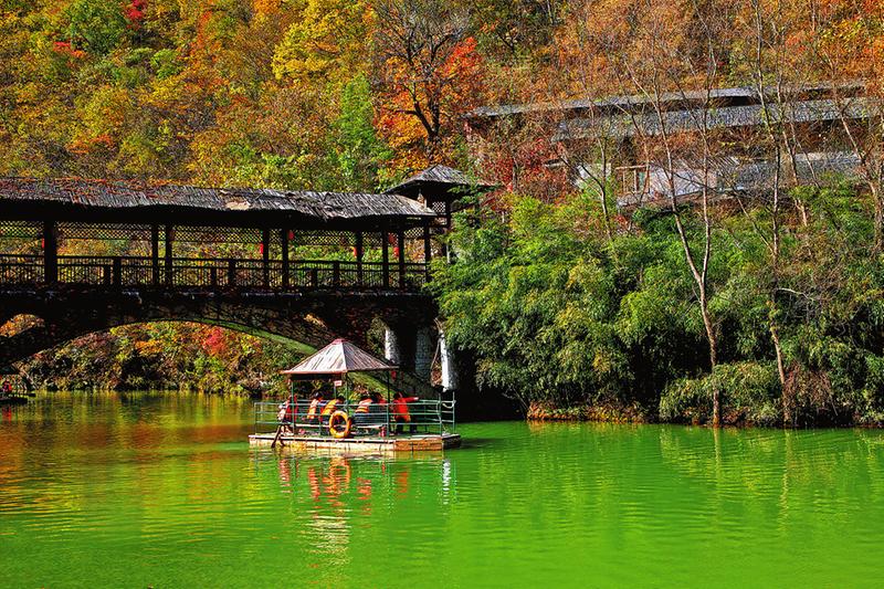 秋天的紅葉是金絲峽別致的封面,金絲峽地處秦嶺南麓,四季分明、資源豐富,森林覆蓋率高達98%,成為秦嶺最早出現紅葉的地區。由于金絲峽植物資源豐富,種類多樣,每年10月中旬至11月下旬,除了最常見的紅葉李、五角楓等,還有金燦燦的銀杏、紅黃相間的火炬樹、深棕色的銀紅槭、深紅色的黃連木等,共同組成了一幅絢爛奪目“紅葉山水”圖。放眼望去,有的樹葉紅得發亮,有的樹葉紅黃相間,有的樹葉黃得透亮,還有的綠瑩瑩的。秋風吹過,一團團顏色一起舞動,仿佛是在歡迎著遠道而來的客人。