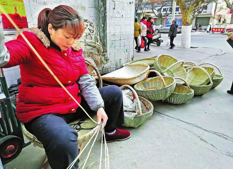 近幾年來,在丹鳳縣城北新街中段,時常可看到一位40歲左右,在一堆竹籠、簸箕、竹篩旁忙著做篾活兒的女人。她沒有固定的攤位和招牌,有時坐在行道樹下,有時坐在路邊墻角,不管春夏秋冬,寒來暑往……