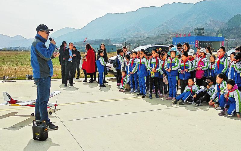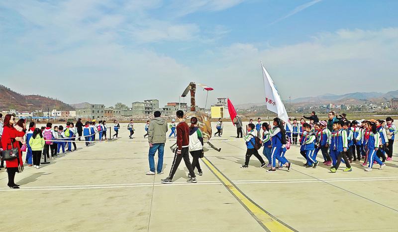 飛行小鎮、通用機場、起降跑道、停機坪、指揮塔臺、直升機、固定翼航空器……3月23日,當這些平時只能在課本上看到圖片的航空實物,展現在商洛市小學50多名學生面前時,孩子們發出了興奮的尖叫。