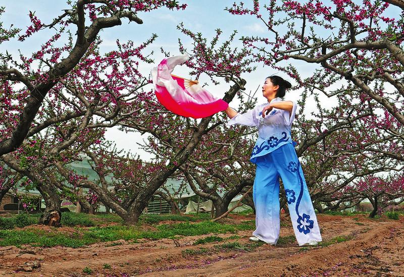 在鮮花盛開的桃樹林里,十幾位穿著民族服裝的女子正在三五成群地分批表演《山清水秀太陽高》,音樂優(yōu)雅,舞姿翩翩。一位帶著孩子的女游客以為她們正在錄制電視節(jié)目,抱著孩子和參加表演的小張瑜合影,原來她把美麗的小張瑜當(dāng)成了專業(yè)演員。