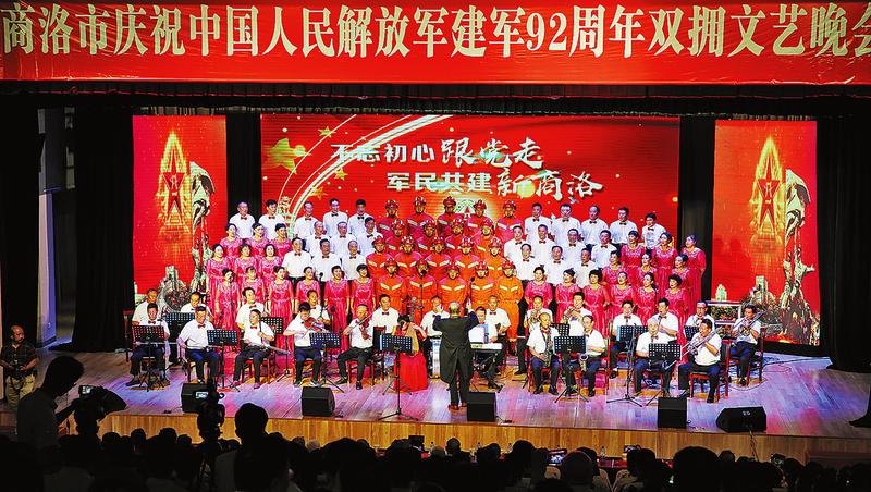 不忘初心跟黨走,軍民共建新商洛。7月31日晚,由市雙擁工作領導小組主辦,市退役軍人事務局、商洛軍分區政治工作處承辦的商洛市慶祝中國人民解放軍建軍92周年雙擁文藝晚會在市行政中心舉行。陳俊、鄭光照、李豫琦、武文罡、牛克儉、于震、張曉明、楊長洲、李華、劉偉、夏啟宗、劉向東等市上領導與駐商部隊廣大官兵、軍隊離退休老干部、部分退役軍人代表等一起共慶建軍佳節,暢敘軍民魚水深情。(記者李敏攝)