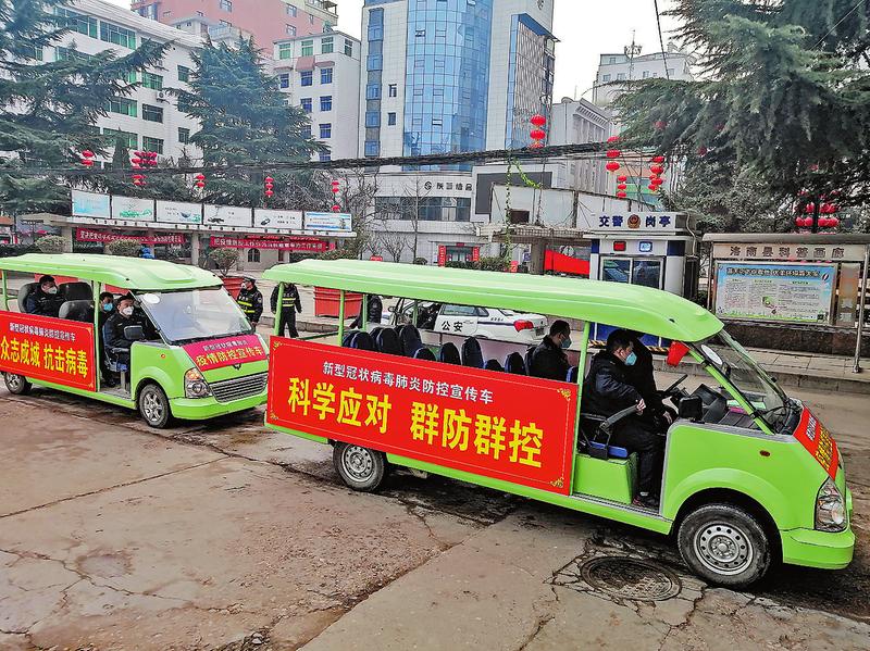 近日,洛南縣不斷加大宣傳力度,著力打贏疫情防控阻擊戰(zhàn)。圖為疫情防控宣傳車輛在城區(qū)沿街宣傳。(閆偉鋒 攝)