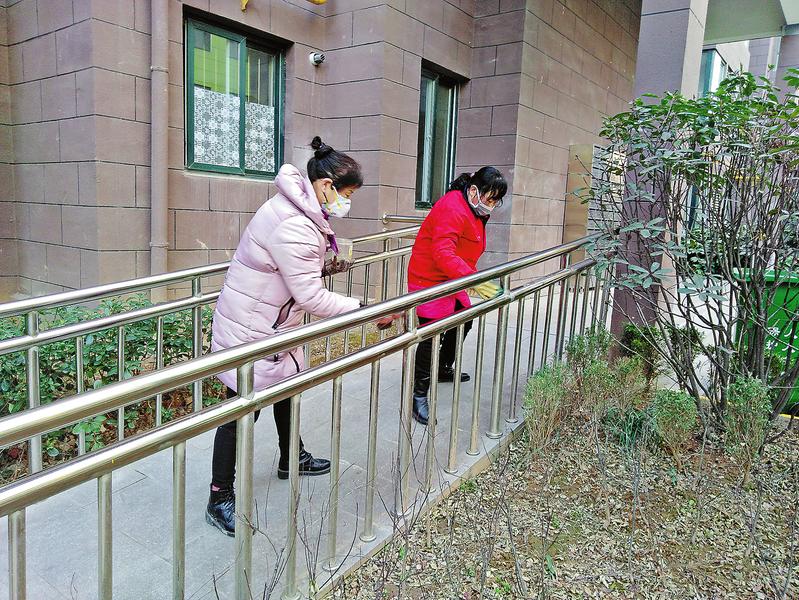2月4日,市區(qū)中心街一家小區(qū),物業(yè)人員對(duì)每棟樓的樓梯、護(hù)欄等進(jìn)行衛(wèi)生清潔并做消毒處理。(記者 賈書章 攝)