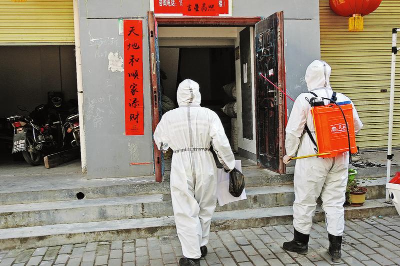 近日,丹鳳縣竹林關(guān)鎮(zhèn)組織專職消防隊(duì)員,對(duì)排查出居住在丹水社區(qū)的18名湖北務(wù)工返鄉(xiāng)人員所在單元樓的樓道、樓梯扶手、各戶房門和門把手,每天進(jìn)行消毒,直至度過隔離期。(邢渭林 攝)