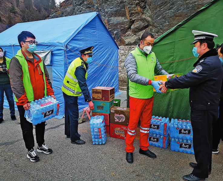 2月18日至19日,商南縣秀水建材市場的114家愛心商戶,先后來到湘河、清油河、試馬等地,向堅守在22處監測點的一線工作人員送去愛心物資。(杜金暉 攝)