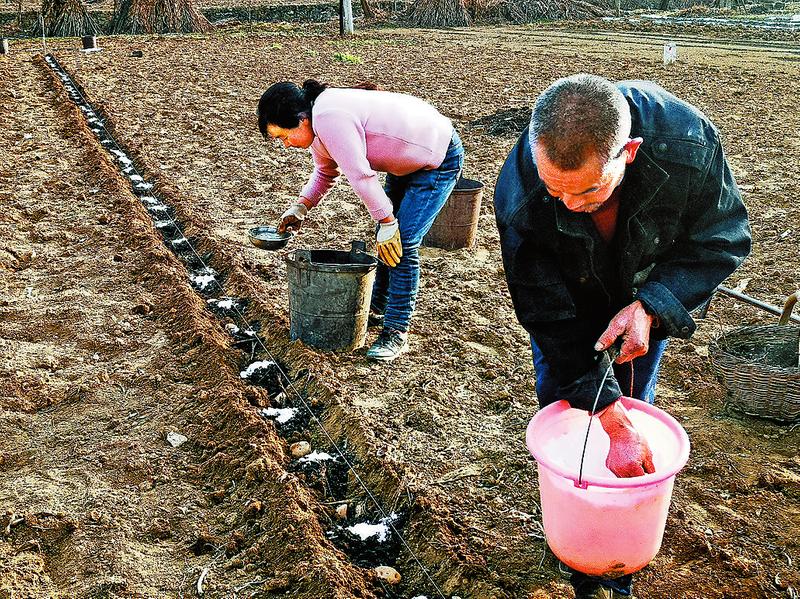 繼續(xù)向西前行,在牧護(hù)關(guān)鎮(zhèn)大商塬村四組遠(yuǎn)遠(yuǎn)看到一家人在田地中不停穿梭。近看,原來這家人在放下洋芋種的時,除了撒上碳酸氫銨肥料,老人還將自己配好的農(nóng)家肥一同撒入。老人說:“今年買了一塊五一斤陜北洋芋種,比去年貴了五毛錢。這一段時間雨水太少,為保洋芋出芽,我家用兩種肥,還多澆了不少水,也不圖賣多少錢就是自己種的給娃們吃放心。”