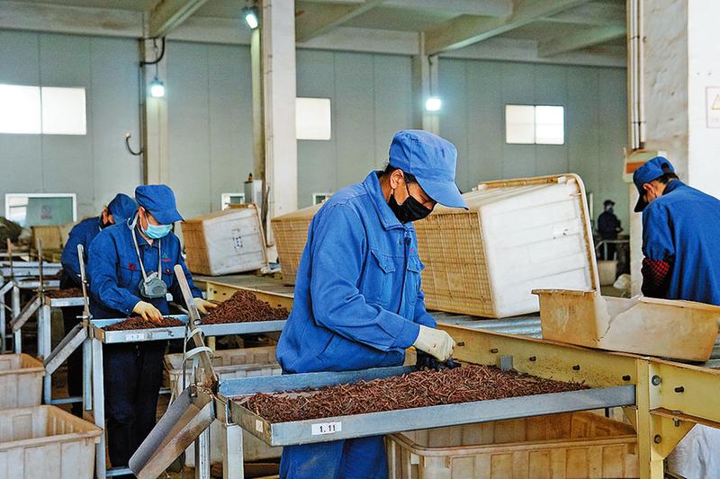 天士力公司里,工人正在挑選藥材。