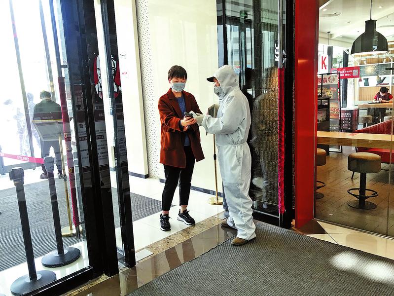 3月18日,某商場(chǎng)門(mén)口,工作人員通過(guò)體溫檢測(cè)和基本身份信息登記,嚴(yán)格篩查進(jìn)出人員。