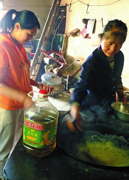 老吳的老伴和女兒忙著做家常菜