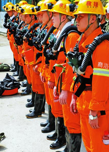 只見商洛市礦山救護隊隊員模擬接警后,迅速穿著重達(dá)20公斤的井下救援裝備集合,指戰(zhàn)員對下井隊員逐個進行氧氣呼吸器戰(zhàn)前檢查后,大家按照命令進入深40米、長1000米的礦井內(nèi)部進行救護演練。