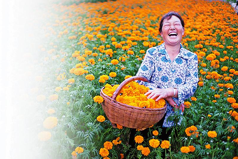 洛南縣采摘萬壽菊的群眾喜笑顏開