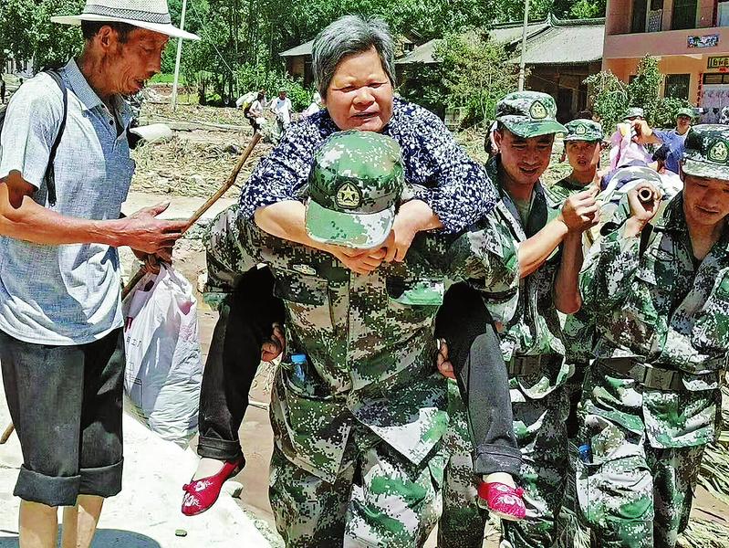 “抗洪救災是我們退伍老兵義不容辭的責任……”8月10日,由全縣41名退伍軍人組成的抗災突擊隊唱著軍歌,背著物資列隊趕赴太白岔村支援。他們中年齡小的20多歲、年齡大的60多歲,有參戰老兵、退伍老兵和退伍女兵,他們發揚人民軍隊“國有難,召必回,戰必勝”的精神支援災區運送物資。