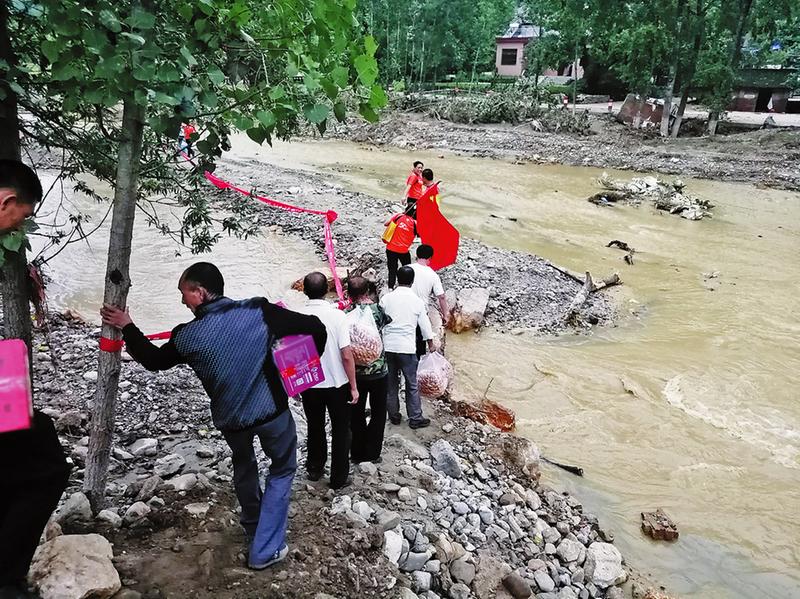 “我請求帶領村黨員干部,趕赴太白岔村運送物資。”8月6日,洪災最重時,石門街社區黨支部書記李新友、劉家社區黨支部書記寇建飛向鎮黨委請愿。征得同意,他們帶著16名黨員干部,背起災區急用物資,翻山越嶺,跋山涉水,經過4個小時徒步把物資安全送到太白岔村。