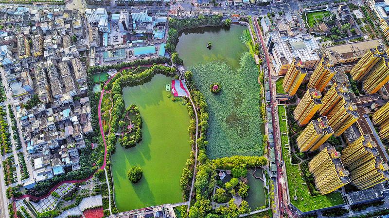 蓮湖公園猶如一塊碧玉鑲嵌在城區的中央,也被稱之為城市“綠肺”。經過擴建后的蓮湖公園總面積達到197.7畝,其中水域面積114.7畝,綠化面積52畝,形成了南湖、北湖兩大板塊,分為入口廣場、湖面水域、健身場地、古城墻展示、休閑綠地、商業步行街等六個功能區,成為市區內集旅游觀光、商業、休閑娛樂、歷史人文等多功能為一體的綜合性生態公園。圖為8月14日,記者航拍的蓮湖公園全景。(記者楊鑫攝)