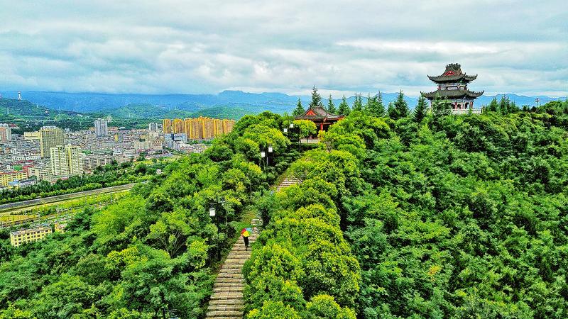 龜山公園東起賀咀村,西至雙乳山,南北臨山體自然坡腳,規劃總面積45公頃。其中人工栽植綠化面積20900平方米,天然林42萬平方米,其中栽植具有地方特色的鄉土適生喬木樹種40多種,2萬多株。公園在綠化養護過程中將落葉和枯枝等有機質覆蓋保育在樹冠下,有效地保護了山體水土流失。2008年以來公園先后進行了三次提升建設,已經成為名副其實的城區中央森林氧吧和供游人休閑運動的城市森林公園。圖為8月17日,記者航拍的龜山公園一角。(記者 楊鑫 攝)