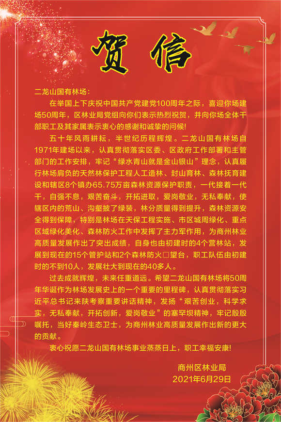 在二龍山林場(chǎng)成立50周年之際主管局發(fā)來(lái)賀信