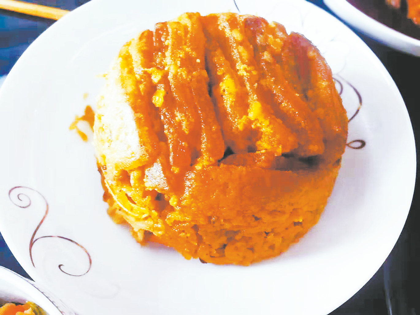 酒席正酣時(shí),廚師將裝粉蒸肉的碗扣在盤子里,揭開(kāi)碗,一盤金黃閃亮的玉米粉蒸肉出鍋了。壓軸大菜玉米粉蒸肉上桌,客人們迫不及待地說(shuō):“吃吧,趁熱吃吧。”夾起一塊肉,玉米面裹著肉片,有紅有白,晶瑩剔透,一口咬下半邊,軟糯而清香,甜酥而爽口,真乃人間至真美味。平日不吃肥肉的女子也禁不住誘惑,免不了夾起一塊粉蒸肉吃下去,最妙的是盤底裹著玉米面的蒸粉條,筷子夾著還在不停地打顫戰(zhàn),與蒸肉的美味相得益彰,吃上一口,香甜無(wú)比。