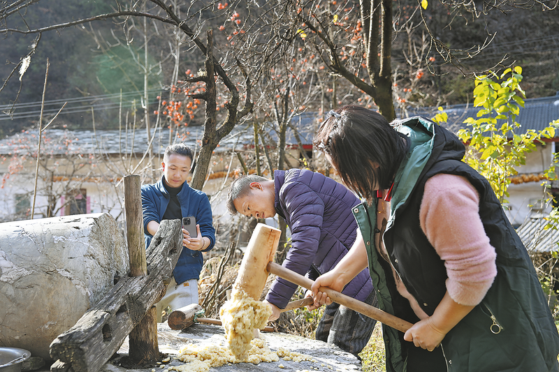 3個年輕人因為沒有經驗,打了近1個小時,仍跟鄭父口中描述的糍粑有差距。實在揮不動榔頭了,就你20下,我20下,換著來。額頭出了汗,力氣也幾乎用完了,糍粑仍然沒成形。于是,他們叫來鄰居家的大嬸指導,大嬸給出的答復是:“再堅持打一會兒,拉起來很細的絲就成了。”于是,3個人又接著打,直到陽光從院子已經回到半山腰,糍粑漸漸才成形。