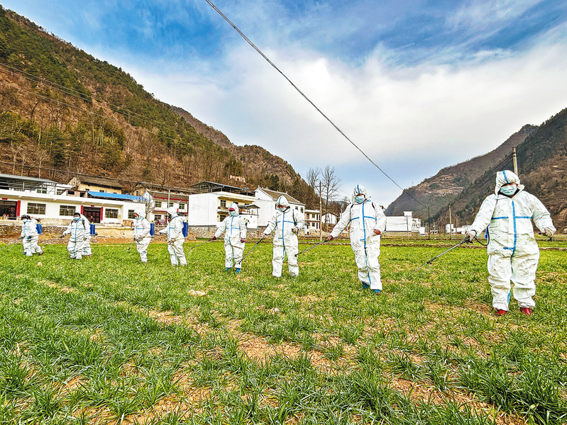 眼下正是小麥春季田間管理的關鍵時期,我市各地搶抓農時節令,積極開展管護工作,為夏糧豐產豐收打下基礎。圖為2月20日,山陽縣農技人員在色河鋪鎮屈家澗村,采用人工噴灑和植保無人機噴灑相結合的方式,對集中成片的麥田開展統防統治。 (本報記者 肖 云 攝)