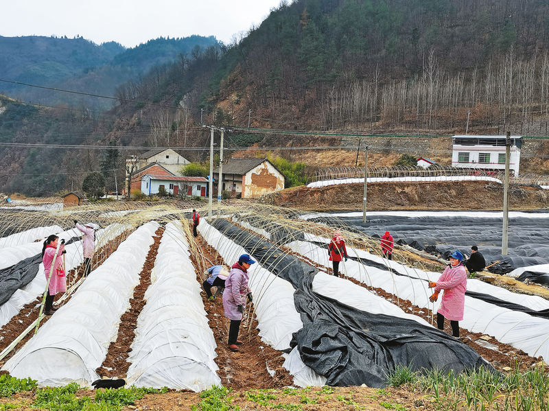 眼下正是春耕備耕的關鍵期,商南縣農業農村局組織技術人員深入農田一線,指導群眾實施田間管理措施。圖為2月17日,商南縣試馬鎮毛河村群眾正在羊肚菌種植基地搭建拱棚、培土、覆膜,及時為菌床保濕增溫。 (本報通訊員 李慧玲 攝)