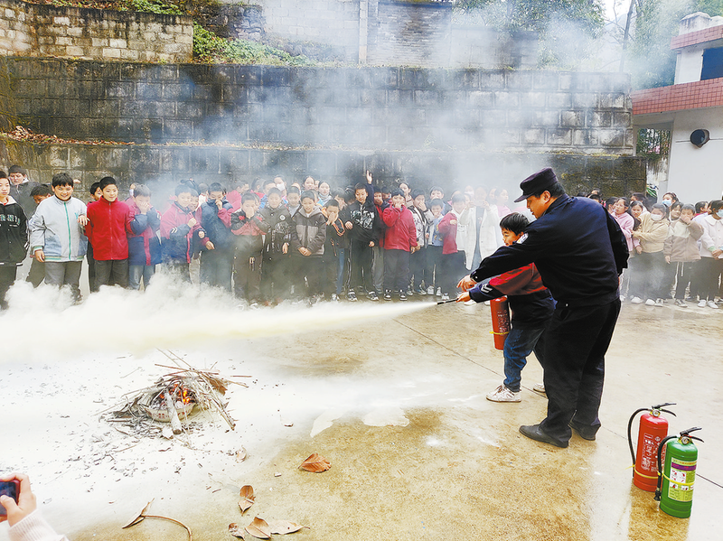 11月9日,鎮安縣公安局西口派出所與西口明德小學聯合組織了一場消防應急演練。民警為廣大師生現場講解消防基本知識、逃生注意事項、現場演示滅火器等使用方法和操作要領,并指導學生體驗滅火過程。(本報通訊員 劉吉濤 攝)