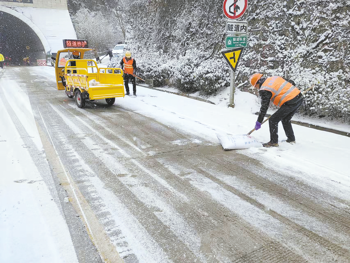 道班工人在鎮(zhèn)安縣風(fēng)凸嶺除雪保暢