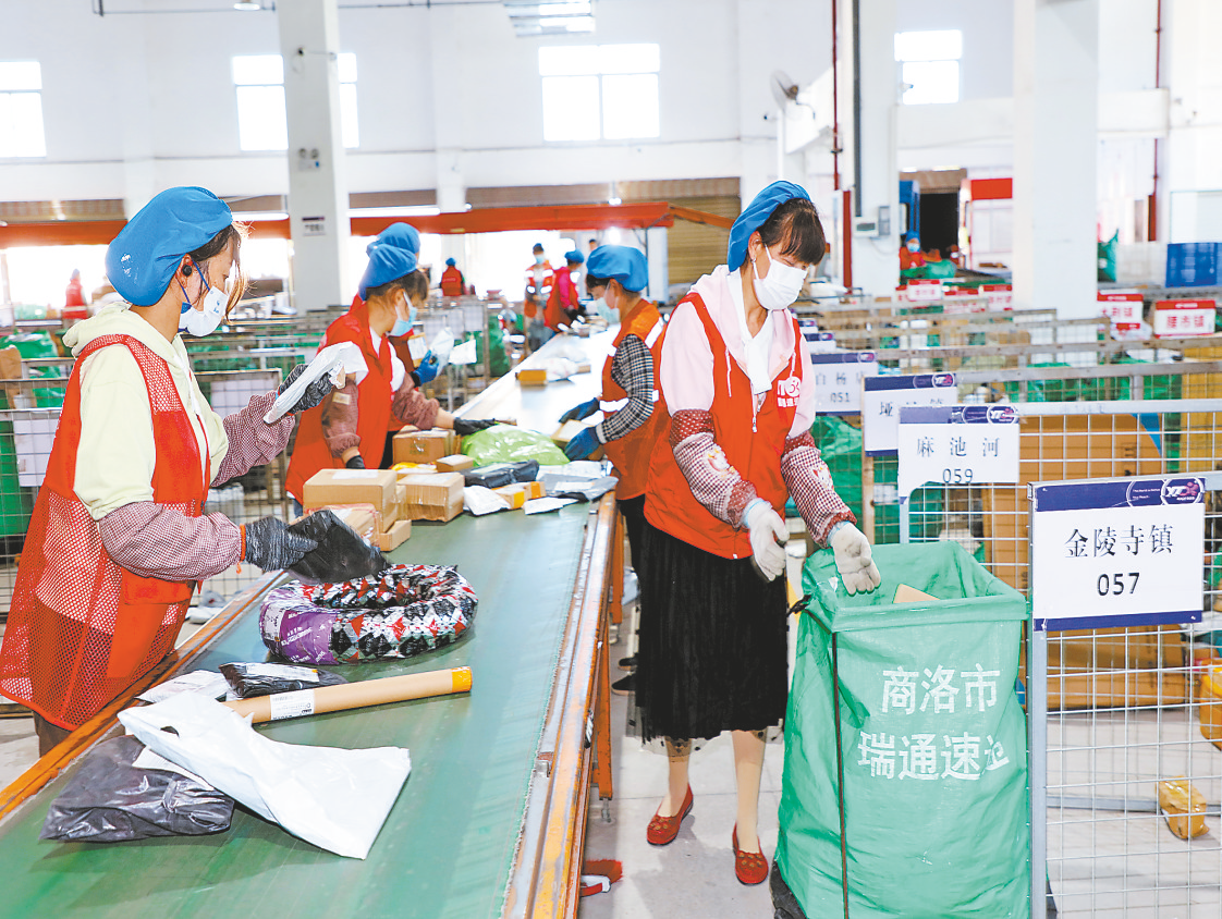 商州區(qū)君威物流園內(nèi)工作人員分揀快遞