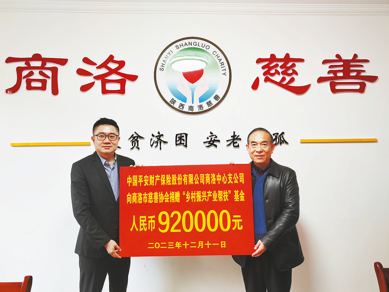 12月11日,中國平安財產保險股份有限公司商洛中心支公司向市慈善協會捐贈“鄉村振興產業幫扶”基金92萬元。多年來,該公司立足于當地農業產業風險保障需求,積極探索各類保險升級服務,持續助力鄉村振興。 (本報通訊員 萬泉山 攝)