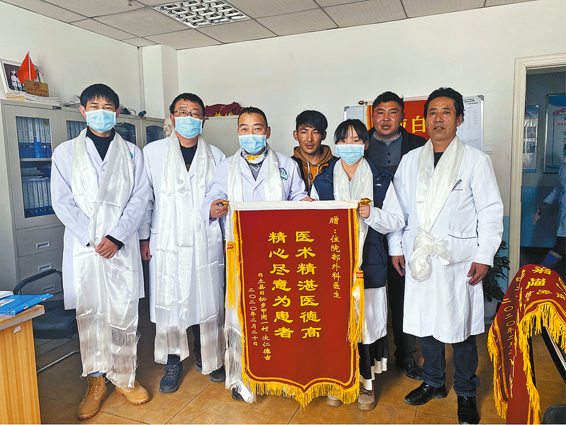 2020年2月,康復患者為趙岳峰(左三)和援藏醫療團隊敬獻哈達和錦旗。