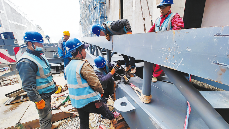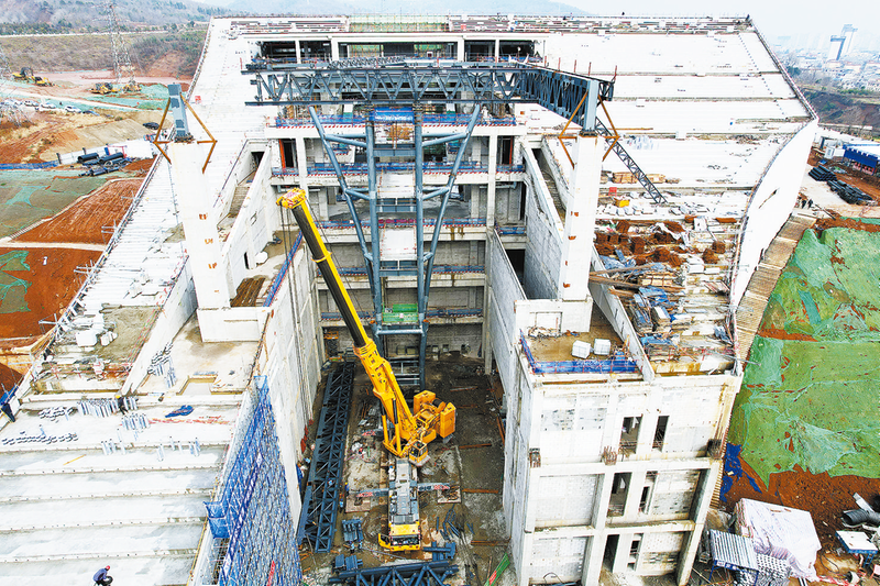 12月11日,氣溫驟降,寒氣襲人。在秦嶺博物館項目施工現場,50多米高的大型吊車旁,10多名工人正在進行博物館中廳巨型鋼結構的吊裝。