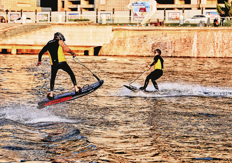 在水中沖浪的兩人是劉強和賈飛,他們玩動力沖浪板已經有一年多時間,每次進行水上沖浪都會引來眾多在公園散步的市民圍觀喝彩。劉強是一名沖浪愛好者,2023年開始了解這項運動,“沖浪讓我更快樂、更健康。我的協調能力更強了,身體素質也提升了不少。”劉強說,練習沖浪沒多久就掌握了技巧,他把沖浪的視頻發在短視頻平臺上,吸引了很多粉絲。賈飛就是通過短視頻平臺認識了劉強,兩人一拍即合,經常相約一起玩沖浪板。