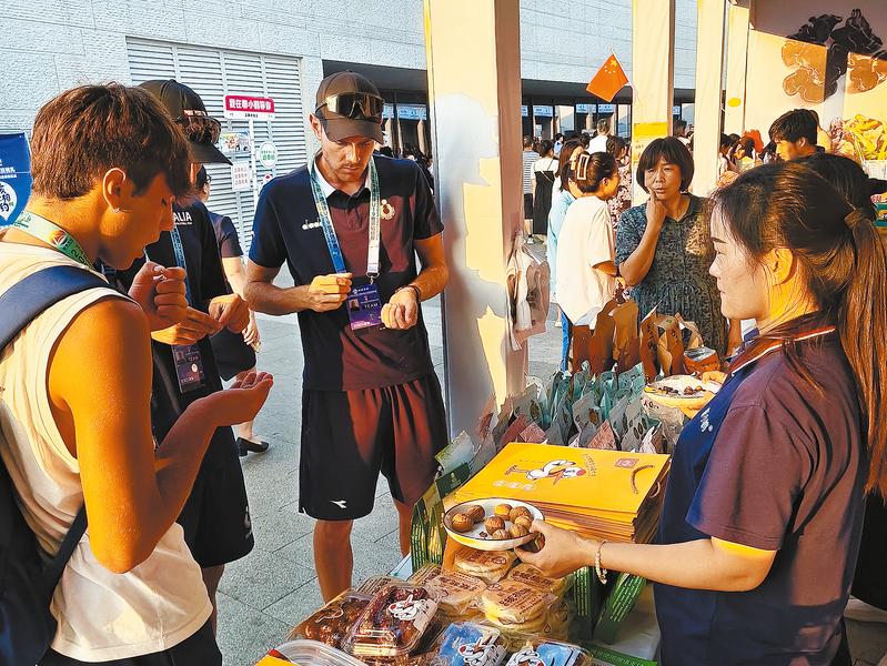 比賽間隙,外國友人在沙灘排球集市品嘗洛南烤核桃。 (本報記者 方 方 攝)