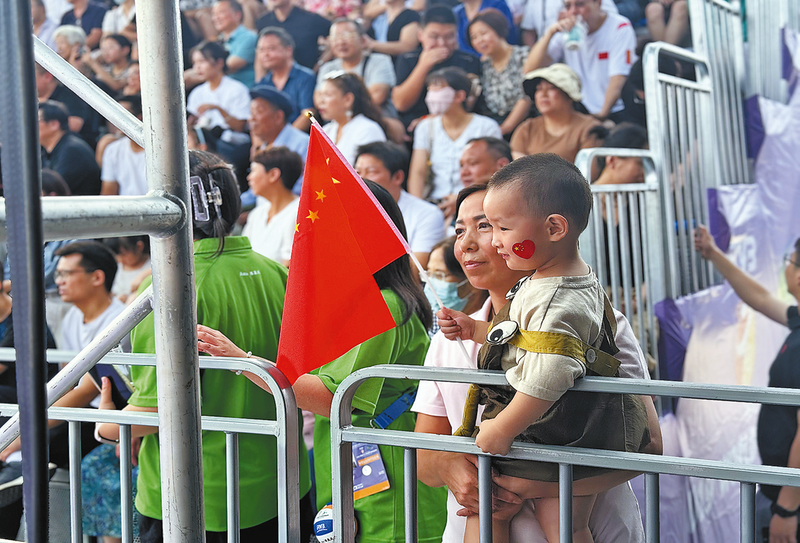 小朋友為運動員搖旗助威( 本報記者 方 方 攝)