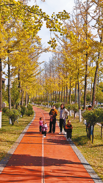 游人在商州區的銀杏公園感受獨特秋景