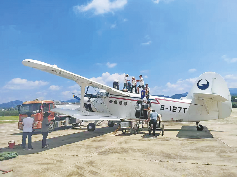 △市飛播站組織裝種隊(duì)向飛機(jī)上加裝樹種,為播撒“綠色希望”做好準(zhǔn)備。