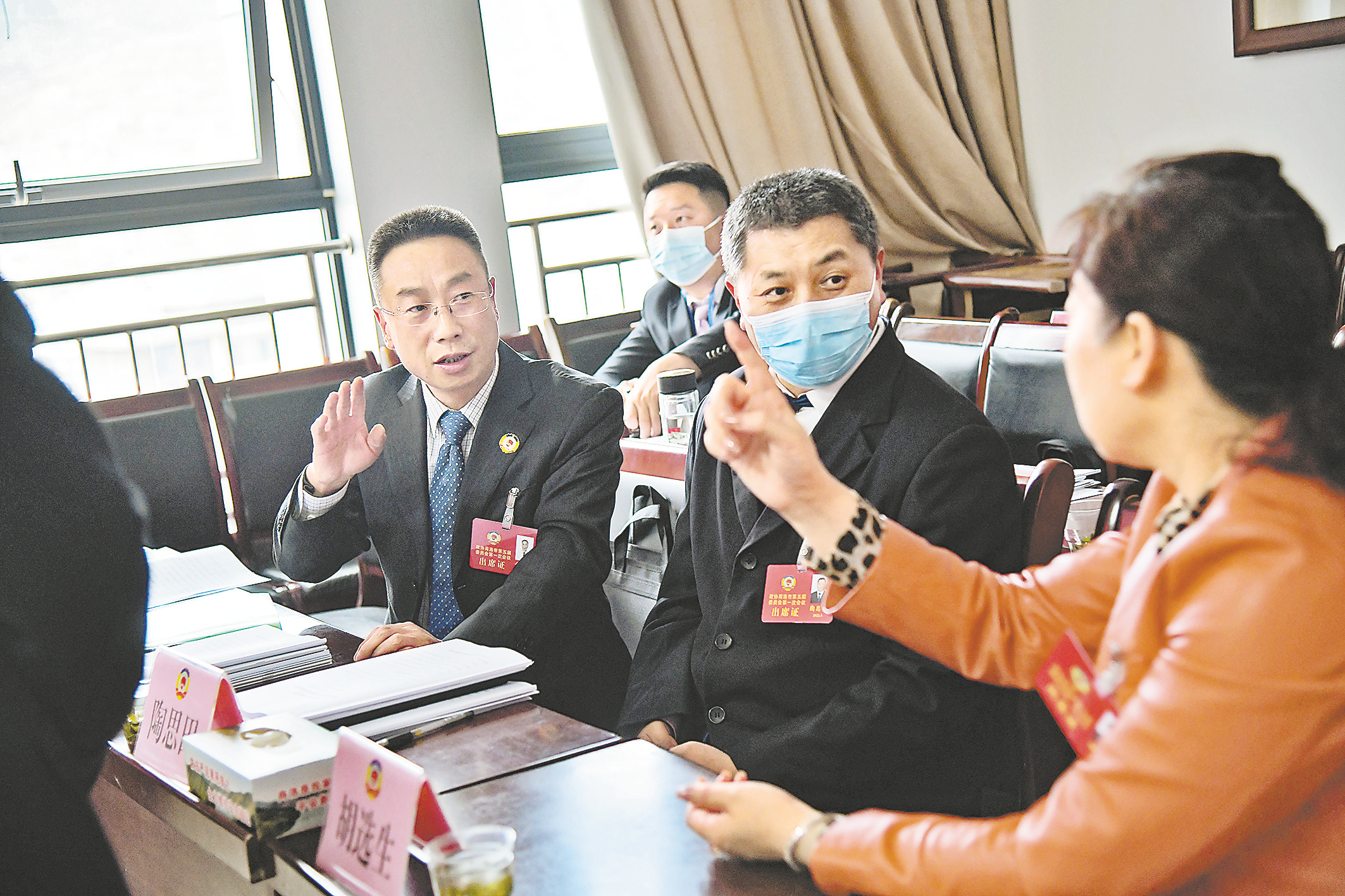 3月27日,黃學斌委員(左一)交流關于進一步完善商洛市急救體系建設,提高院前急救水平的建議。(本報記者 侯 彬 攝)