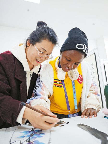 12月9日,參賽隊員分批走進商洛中學、商州區高級中學等6所學校,開展文化體驗日活動。圖為商洛中學老師教烏干達運動員畫國畫。 (本報記者 景 康 攝)