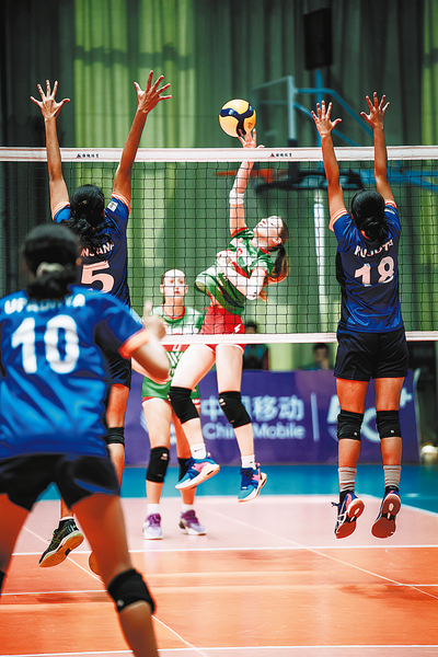 ⑥12月11日,在保加利亞隊和印度隊的比賽中,保加利亞女隊員的扣球瞬間。