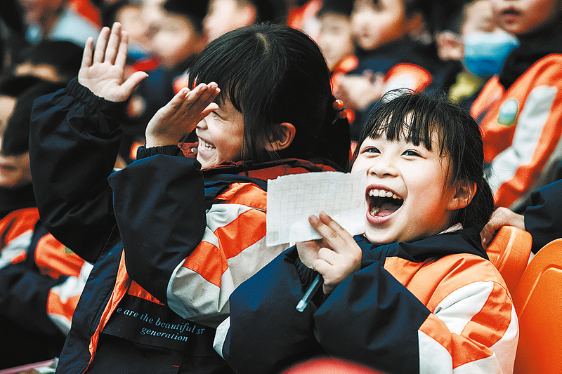?精彩的比賽引得看臺上的小學生熱烈鼓掌歡呼。
